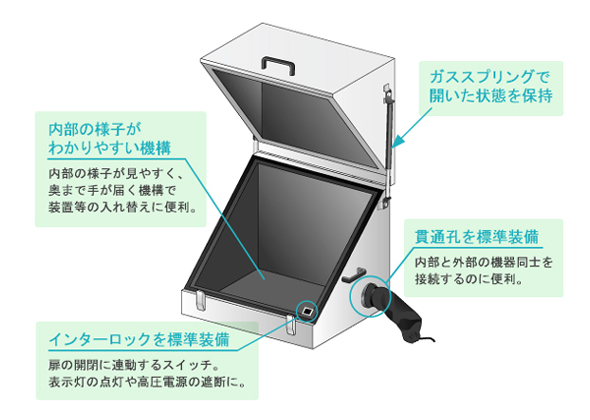 作業性に優れた機構で、開いた時に内部の様子が見やすく装置の調整や機器の入れ替え等が容易です。